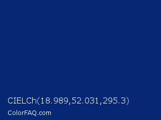 CIELCh 18.989,52.031,295.3 Color is a dark blue color and the nearest color is Catalina Blue #062a78. Hex code #052774 and RGB value is rgb(5,39,116). In RGB color space, this color is composed of 2% red, 15% green, 45% blue, In CMYK color space, this color is composed of 96% cyan, 66% magenta, 0% yellow , 55% black , In HSL color space, this color has a hue angle of 222° , 92% saturation and 24% lightness.