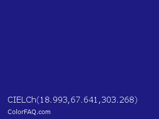 CIELCh 18.993,67.641,303.268 Color is a normal indigo color and the nearest color is Jacksons Purple #20208d. Hex code #1e1c83 and RGB value is rgb(30,28,131). In RGB color space, this color is composed of 12% red, 11% green, 51% blue, In CMYK color space, this color is composed of 77% cyan, 79% magenta, 0% yellow , 49% black , In HSL color space, this color has a hue angle of 241° , 65% saturation and 31% lightness.