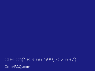 CIELCh 18.9,66.599,302.637 Color is a normal blue color and the nearest color is Jacksons Purple #20208d. Hex code #1b1d82 and RGB value is rgb(27,29,130). In RGB color space, this color is composed of 11% red, 11% green, 51% blue, In CMYK color space, this color is composed of 79% cyan, 78% magenta, 0% yellow , 49% black , In HSL color space, this color has a hue angle of 239° , 66% saturation and 31% lightness.