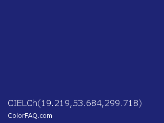CIELCh 19.219,53.684,299.718 Color is a dark blue color and the nearest color is St Patricks Blue #23297a. Hex code #1e2474 and RGB value is rgb(30,36,116). In RGB color space, this color is composed of 12% red, 14% green, 45% blue, In CMYK color space, this color is composed of 74% cyan, 69% magenta, 0% yellow , 55% black , In HSL color space, this color has a hue angle of 236° , 59% saturation and 29% lightness.