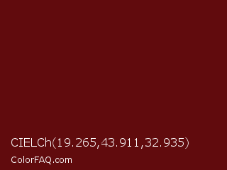 CIELCh 19.265,43.911,32.935 Color is a very dark red color and the nearest color is Dark Tan #661010. Hex code #610b0d and RGB value is rgb(97,11,13). In RGB color space, this color is composed of 38% red, 4% green, 5% blue, In CMYK color space, this color is composed of 0% cyan, 89% magenta, 87% yellow , 62% black , In HSL color space, this color has a hue angle of 359° , 80% saturation and 21% lightness.