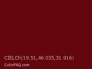 CIELCh 19.51,46.035,31.916 Color is a very dark red color and the nearest color is Rosewood #65000b. Hex code #64060d and RGB value is rgb(100,6,13). In RGB color space, this color is composed of 39% red, 2% green, 5% blue, In CMYK color space, this color is composed of 0% cyan, 94% magenta, 87% yellow , 61% black , In HSL color space, this color has a hue angle of 356° , 89% saturation and 21% lightness.