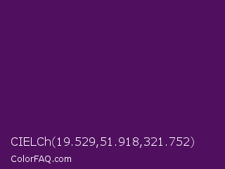 CIELCh 19.529,51.918,321.752 Color is a very dark purple color and the nearest color is Scarlet Gum #431560. Hex code #500f5f and RGB value is rgb(80,15,95). In RGB color space, this color is composed of 31% red, 6% green, 37% blue, In CMYK color space, this color is composed of 16% cyan, 84% magenta, 0% yellow , 63% black , In HSL color space, this color has a hue angle of 289° , 73% saturation and 22% lightness.
