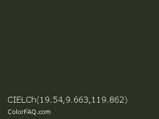 CIELCh 19.54,9.663,119.862 Color is a very dark lime color and the nearest color is Rangitoto #2e3222. Hex code #2d3123 and RGB value is rgb(45,49,35). In RGB color space, this color is composed of 18% red, 19% green, 14% blue, In CMYK color space, this color is composed of 8% cyan, 0% magenta, 29% yellow , 81% black , In HSL color space, this color has a hue angle of 77° , 17% saturation and 16% lightness.
