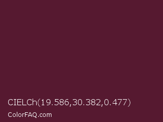 CIELCh 19.586,30.382,0.477 Color is a very dark rose color and the nearest color is Wine Berry #591d35. Hex code #561930 and RGB value is rgb(86,25,48). In RGB color space, this color is composed of 34% red, 10% green, 19% blue, In CMYK color space, this color is composed of 0% cyan, 71% magenta, 44% yellow , 66% black , In HSL color space, this color has a hue angle of 337° , 55% saturation and 22% lightness.