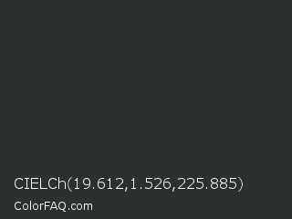 CIELCh 19.612,1.526,225.885 Color is a very dark blue color and the nearest color is Mine Shaft #323232. Hex code #2d3031 and RGB value is rgb(45,48,49). In RGB color space, this color is composed of 18% red, 19% green, 19% blue, In CMYK color space, this color is composed of 8% cyan, 2% magenta, 0% yellow , 81% black , In HSL color space, this color has a hue angle of 195° , 4% saturation and 18% lightness.