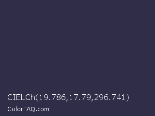 CIELCh 19.786,17.79,296.741 Color is a dark indigo color and the nearest color is Tuna #353542. Hex code #2f2d47 and RGB value is rgb(47,45,71). In RGB color space, this color is composed of 18% red, 18% green, 28% blue, In CMYK color space, this color is composed of 34% cyan, 37% magenta, 0% yellow , 72% black , In HSL color space, this color has a hue angle of 245° , 22% saturation and 23% lightness.