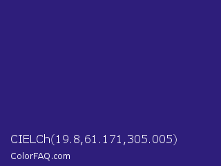 CIELCh 19.8,61.171,305.005 Color is a dark indigo color and the nearest color is Persian Indigo #32127a. Hex code #2e1e7b and RGB value is rgb(46,30,123). In RGB color space, this color is composed of 18% red, 12% green, 48% blue, In CMYK color space, this color is composed of 63% cyan, 76% magenta, 0% yellow , 52% black , In HSL color space, this color has a hue angle of 250° , 61% saturation and 30% lightness.