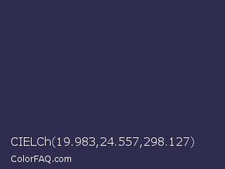 CIELCh 19.983,24.557,298.127 Color is a dark indigo color and the nearest color is Martinique #363050. Hex code #2f2c50 and RGB value is rgb(47,44,80). In RGB color space, this color is composed of 18% red, 17% green, 31% blue, In CMYK color space, this color is composed of 41% cyan, 45% magenta, 0% yellow , 69% black , In HSL color space, this color has a hue angle of 245° , 29% saturation and 24% lightness.