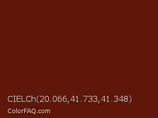 CIELCh 20.066,41.733,41.348 Color is a very dark red color and the nearest color is Redwood #5d1e0f. Hex code #5e1706 and RGB value is rgb(94,23,6). In RGB color space, this color is composed of 37% red, 9% green, 2% blue, In CMYK color space, this color is composed of 0% cyan, 76% magenta, 94% yellow , 63% black , In HSL color space, this color has a hue angle of 12° , 88% saturation and 20% lightness.