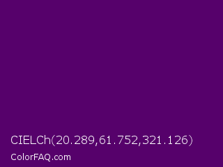 CIELCh 20.289,61.752,321.126 Color is a very dark purple color and the nearest color is Pigment Indigo #4b0082. Hex code #56016b and RGB value is rgb(86,1,107). In RGB color space, this color is composed of 34% red, 0% green, 42% blue, In CMYK color space, this color is composed of 20% cyan, 99% magenta, 0% yellow , 58% black , In HSL color space, this color has a hue angle of 288° , 98% saturation and 21% lightness.