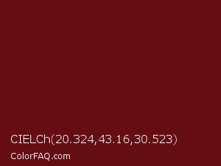 CIELCh 20.324,43.16,30.523 Color is a very dark red color and the nearest color is Dark Tan #661010. Hex code #640e13 and RGB value is rgb(100,14,19). In RGB color space, this color is composed of 39% red, 5% green, 7% blue, In CMYK color space, this color is composed of 0% cyan, 86% magenta, 81% yellow , 61% black , In HSL color space, this color has a hue angle of 357° , 75% saturation and 22% lightness.