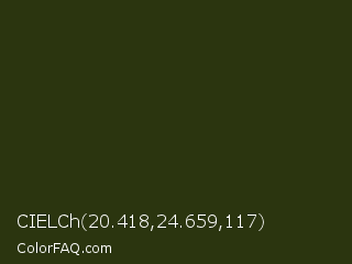 CIELCh 20.418,24.659,117 Color is a very dark lime color and the nearest color is Turtle Green #2a380b. Hex code #2b350f and RGB value is rgb(43,53,15). In RGB color space, this color is composed of 17% red, 21% green, 6% blue, In CMYK color space, this color is composed of 19% cyan, 0% magenta, 72% yellow , 79% black , In HSL color space, this color has a hue angle of 76° , 56% saturation and 13% lightness.