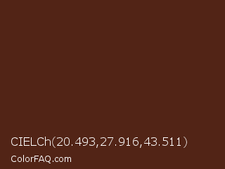 CIELCh 20.493,27.916,43.511 Color is a very dark red color and the nearest color is Brown Derby #492615. Hex code #522416 and RGB value is rgb(82,36,22). In RGB color space, this color is composed of 32% red, 14% green, 9% blue, In CMYK color space, this color is composed of 0% cyan, 56% magenta, 73% yellow , 68% black , In HSL color space, this color has a hue angle of 14° , 58% saturation and 20% lightness.