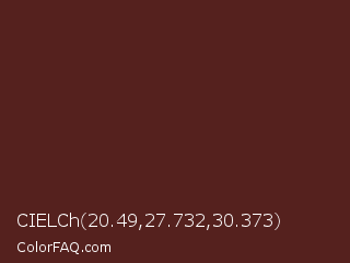 CIELCh 20.49,27.732,30.373 Color is a dark red color and the nearest color is Caput Mortuum #592720. Hex code #55211e and RGB value is rgb(85,33,30). In RGB color space, this color is composed of 33% red, 13% green, 12% blue, In CMYK color space, this color is composed of 0% cyan, 61% magenta, 65% yellow , 67% black , In HSL color space, this color has a hue angle of 3° , 48% saturation and 23% lightness.