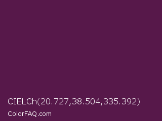 CIELCh 20.727,38.504,335.392 Color is a very dark magenta color and the nearest color is Wine Berry #591d35. Hex code #57184a and RGB value is rgb(87,24,74). In RGB color space, this color is composed of 34% red, 9% green, 29% blue, In CMYK color space, this color is composed of 0% cyan, 72% magenta, 15% yellow , 66% black , In HSL color space, this color has a hue angle of 312° , 57% saturation and 22% lightness.