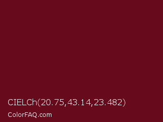 CIELCh 20.75,43.14,23.482 Color is a very dark red color and the nearest color is Dark Tan #661010. Hex code #670a1b and RGB value is rgb(103,10,27). In RGB color space, this color is composed of 40% red, 4% green, 11% blue, In CMYK color space, this color is composed of 0% cyan, 90% magenta, 74% yellow , 60% black , In HSL color space, this color has a hue angle of 349° , 82% saturation and 22% lightness.