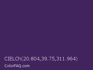 CIELCh 20.804,39.75,311.964 Color is a dark violet color and the nearest color is Bossanova #4e2a5a. Hex code #41245e and RGB value is rgb(65,36,94). In RGB color space, this color is composed of 25% red, 14% green, 37% blue, In CMYK color space, this color is composed of 31% cyan, 62% magenta, 0% yellow , 63% black , In HSL color space, this color has a hue angle of 270° , 45% saturation and 25% lightness.