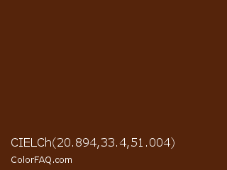 CIELCh 20.894,33.4,51.004 Color is a very dark orange color and the nearest color is Cioccolato #55280c. Hex code #55240b and RGB value is rgb(85,36,11). In RGB color space, this color is composed of 33% red, 14% green, 4% blue, In CMYK color space, this color is composed of 0% cyan, 58% magenta, 87% yellow , 67% black , In HSL color space, this color has a hue angle of 20° , 77% saturation and 19% lightness.