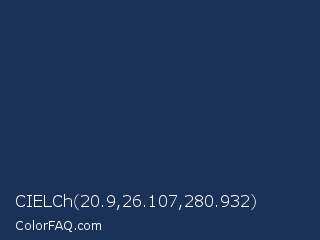 CIELCh 20.9,26.107,280.932 Color is a dark blue color and the nearest color is Cello #1e385b. Hex code #1b3258 and RGB value is rgb(27,50,88). In RGB color space, this color is composed of 11% red, 20% green, 35% blue, In CMYK color space, this color is composed of 69% cyan, 43% magenta, 0% yellow , 65% black , In HSL color space, this color has a hue angle of 217° , 53% saturation and 23% lightness.