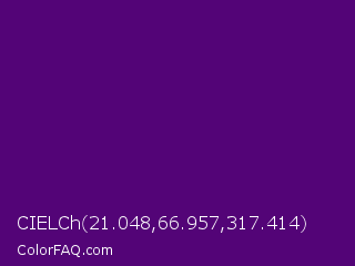 CIELCh 21.048,66.957,317.414 Color is a dark purple color and the nearest color is Pigment Indigo #4b0082. Hex code #530477 and RGB value is rgb(83,4,119). In RGB color space, this color is composed of 33% red, 2% green, 47% blue, In CMYK color space, this color is composed of 30% cyan, 97% magenta, 0% yellow , 53% black , In HSL color space, this color has a hue angle of 281° , 93% saturation and 24% lightness.