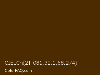 CIELCh 21.081,32.1,68.274 Color is a very dark orange color and the nearest color is Bracken #4a2a04. Hex code #4c2b01 and RGB value is rgb(76,43,1). In RGB color space, this color is composed of 30% red, 17% green, 0% blue, In CMYK color space, this color is composed of 0% cyan, 43% magenta, 99% yellow , 70% black , In HSL color space, this color has a hue angle of 34° , 97% saturation and 15% lightness.
