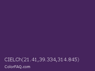 CIELCh 21.41,39.334,314.845 Color is a dark purple color and the nearest color is Bossanova #4e2a5a. Hex code #46245d and RGB value is rgb(70,36,93). In RGB color space, this color is composed of 27% red, 14% green, 36% blue, In CMYK color space, this color is composed of 25% cyan, 61% magenta, 0% yellow , 64% black , In HSL color space, this color has a hue angle of 276° , 44% saturation and 25% lightness.