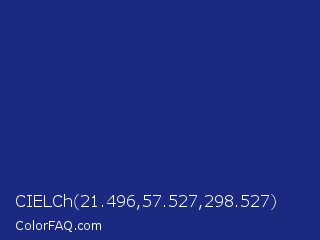 CIELCh 21.496,57.527,298.527 Color is a dark blue color and the nearest color is St Patricks Blue #23297a. Hex code #1b2980 and RGB value is rgb(27,41,128). In RGB color space, this color is composed of 11% red, 16% green, 50% blue, In CMYK color space, this color is composed of 79% cyan, 68% magenta, 0% yellow , 50% black , In HSL color space, this color has a hue angle of 232° , 65% saturation and 30% lightness.