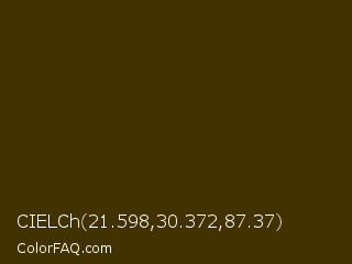 CIELCh 21.598,30.372,87.37 Color is a very dark yellow color and the nearest color is Madras #3f3002. Hex code #413200 and RGB value is rgb(65,50,0). In RGB color space, this color is composed of 25% red, 20% green, 0% blue, In CMYK color space, this color is composed of 0% cyan, 23% magenta, 100% yellow , 75% black , In HSL color space, this color has a hue angle of 46° , 100% saturation and 13% lightness.