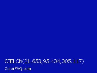 CIELCh 21.653,95.434,305.117 Color is a normal blue color and the nearest color is Zaffre #0014a8. Hex code #0510ad and RGB value is rgb(5,16,173). In RGB color space, this color is composed of 2% red, 6% green, 68% blue, In CMYK color space, this color is composed of 97% cyan, 91% magenta, 0% yellow , 32% black , In HSL color space, this color has a hue angle of 236° , 94% saturation and 35% lightness.