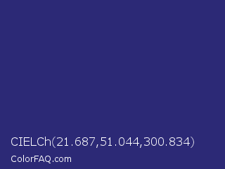 CIELCh 21.687,51.044,300.834 Color is a normal indigo color and the nearest color is St Patricks Blue #23297a. Hex code #2c2976 and RGB value is rgb(44,41,118). In RGB color space, this color is composed of 17% red, 16% green, 46% blue, In CMYK color space, this color is composed of 63% cyan, 65% magenta, 0% yellow , 54% black , In HSL color space, this color has a hue angle of 242° , 48% saturation and 31% lightness.