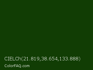 CIELCh 21.819,38.654,133.888 Color is a very dark green color and the nearest color is Dark Fern #0a480d. Hex code #113d04 and RGB value is rgb(17,61,4). In RGB color space, this color is composed of 7% red, 24% green, 2% blue, In CMYK color space, this color is composed of 72% cyan, 0% magenta, 93% yellow , 76% black , In HSL color space, this color has a hue angle of 106° , 88% saturation and 13% lightness.