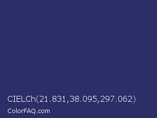 CIELCh 21.831,38.095,297.062 Color is a dark blue color and the nearest color is Deep Koamaru #333366. Hex code #2c2e67 and RGB value is rgb(44,46,103). In RGB color space, this color is composed of 17% red, 18% green, 40% blue, In CMYK color space, this color is composed of 57% cyan, 55% magenta, 0% yellow , 60% black , In HSL color space, this color has a hue angle of 238° , 40% saturation and 29% lightness.