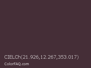 CIELCh 21.926,12.267,353.017 Color is a dark rose color and the nearest color is Woody Brown #483131. Hex code #452e37 and RGB value is rgb(69,46,55). In RGB color space, this color is composed of 27% red, 18% green, 22% blue, In CMYK color space, this color is composed of 0% cyan, 33% magenta, 20% yellow , 73% black , In HSL color space, this color has a hue angle of 337° , 20% saturation and 23% lightness.