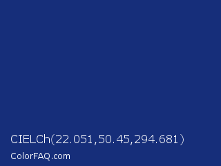 CIELCh 22.051,50.45,294.681 Color is a dark blue color and the nearest color is St Patricks Blue #23297a. Hex code #162e7a and RGB value is rgb(22,46,122). In RGB color space, this color is composed of 9% red, 18% green, 48% blue, In CMYK color space, this color is composed of 82% cyan, 62% magenta, 0% yellow , 52% black , In HSL color space, this color has a hue angle of 226° , 69% saturation and 28% lightness.