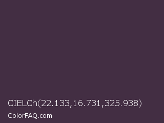 CIELCh 22.133,16.731,325.938 Color is a very dark magenta color and the nearest color is Ship Gray #3e3a44. Hex code #432e43 and RGB value is rgb(67,46,67). In RGB color space, this color is composed of 26% red, 18% green, 26% blue, In CMYK color space, this color is composed of 0% cyan, 31% magenta, 0% yellow , 74% black , In HSL color space, this color has a hue angle of 300° , 19% saturation and 22% lightness.