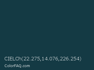 CIELCh 22.275,14.076,226.254 Color is a very dark cyan color and the nearest color is Elephant #123447. Hex code #143a44 and RGB value is rgb(20,58,68). In RGB color space, this color is composed of 8% red, 23% green, 27% blue, In CMYK color space, this color is composed of 71% cyan, 15% magenta, 0% yellow , 73% black , In HSL color space, this color has a hue angle of 193° , 55% saturation and 17% lightness.