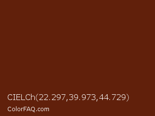 CIELCh 22.297,39.973,44.729 Color is a very dark color and the nearest color is Redwood #5d1e0f. Hex code #61200b and RGB value is rgb(97,32,11). In RGB color space, this color is composed of 38% red, 13% green, 4% blue, In CMYK color space, this color is composed of 0% cyan, 67% magenta, 89% yellow , 62% black , In HSL color space, this color has a hue angle of 15° , 80% saturation and 21% lightness.