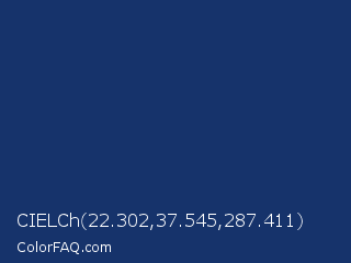 CIELCh 22.302,37.545,287.411 Color is a dark blue color and the nearest color is Biscay #1b3162. Hex code #16336b and RGB value is rgb(22,51,107). In RGB color space, this color is composed of 9% red, 20% green, 42% blue, In CMYK color space, this color is composed of 79% cyan, 52% magenta, 0% yellow , 58% black , In HSL color space, this color has a hue angle of 220° , 66% saturation and 25% lightness.