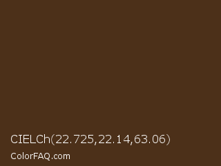CIELCh 22.725,22.14,63.06 Color is a very dark orange color and the nearest color is Metallic Bronze #49371b. Hex code #4c3019 and RGB value is rgb(76,48,25). In RGB color space, this color is composed of 30% red, 19% green, 10% blue, In CMYK color space, this color is composed of 0% cyan, 37% magenta, 67% yellow , 70% black , In HSL color space, this color has a hue angle of 27° , 50% saturation and 20% lightness.