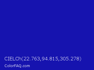 CIELCh 22.763,94.815,305.278 Color is a normal indigo color and the nearest color is Zaffre #0014a8. Hex code #1613af and RGB value is rgb(22,19,175). In RGB color space, this color is composed of 9% red, 7% green, 69% blue, In CMYK color space, this color is composed of 87% cyan, 89% magenta, 0% yellow , 31% black , In HSL color space, this color has a hue angle of 241° , 80% saturation and 38% lightness.