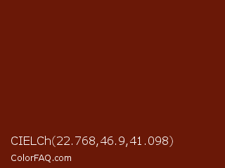 CIELCh 22.768,46.9,41.098 Color is a very dark red color and the nearest color is Cedar Wood Finish #711a00. Hex code #6a1807 and RGB value is rgb(106,24,7). In RGB color space, this color is composed of 42% red, 9% green, 3% blue, In CMYK color space, this color is composed of 0% cyan, 77% magenta, 93% yellow , 58% black , In HSL color space, this color has a hue angle of 10° , 88% saturation and 22% lightness.