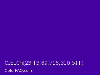 CIELCh 23.13,89.715,310.511 Color is a normal violet color and the nearest color is Pigment Indigo #4b0082. Hex code #4500a1 and RGB value is rgb(69,0,161). In RGB color space, this color is composed of 27% red, 0% green, 63% blue, In CMYK color space, this color is composed of 57% cyan, 100% magenta, 0% yellow , 37% black , In HSL color space, this color has a hue angle of 266° , 100% saturation and 32% lightness.