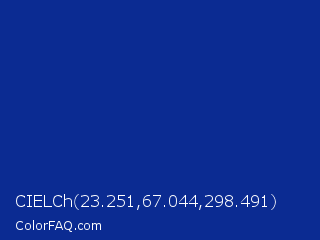 CIELCh 23.251,67.044,298.491 Color is a normal blue color and the nearest color is Indigo Dye #091f92. Hex code #0b2b92 and RGB value is rgb(11,43,146). In RGB color space, this color is composed of 4% red, 17% green, 57% blue, In CMYK color space, this color is composed of 92% cyan, 71% magenta, 0% yellow , 43% black , In HSL color space, this color has a hue angle of 226° , 86% saturation and 31% lightness.