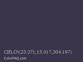 CIELCh 23.271,15.017,304.197 Color is a dark indigo color and the nearest color is Martinique #363050. Hex code #3b344a and RGB value is rgb(59,52,74). In RGB color space, this color is composed of 23% red, 20% green, 29% blue, In CMYK color space, this color is composed of 20% cyan, 30% magenta, 0% yellow , 71% black , In HSL color space, this color has a hue angle of 259° , 17% saturation and 25% lightness.
