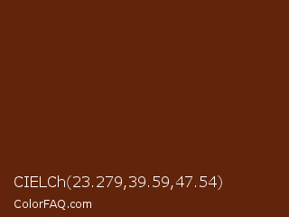 CIELCh 23.279,39.59,47.54 Color is a very dark orange color and the nearest color is Redwood #5d1e0f. Hex code #62240b and RGB value is rgb(98,36,11). In RGB color space, this color is composed of 38% red, 14% green, 4% blue, In CMYK color space, this color is composed of 0% cyan, 63% magenta, 89% yellow , 62% black , In HSL color space, this color has a hue angle of 17° , 80% saturation and 21% lightness.