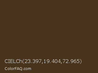 CIELCh 23.397,19.404,72.965 Color is a very dark orange color and the nearest color is Metallic Bronze #49371b. Hex code #48341c and RGB value is rgb(72,52,28). In RGB color space, this color is composed of 28% red, 20% green, 11% blue, In CMYK color space, this color is composed of 0% cyan, 28% magenta, 61% yellow , 72% black , In HSL color space, this color has a hue angle of 33° , 44% saturation and 20% lightness.