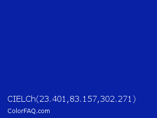 CIELCh 23.401,83.157,302.271 Color is a normal blue color and the nearest color is Blue Pantone #0018a8. Hex code #0922a5 and RGB value is rgb(9,34,165). In RGB color space, this color is composed of 4% red, 13% green, 65% blue, In CMYK color space, this color is composed of 95% cyan, 79% magenta, 0% yellow , 35% black , In HSL color space, this color has a hue angle of 230° , 90% saturation and 34% lightness.