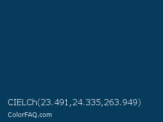 CIELCh 23.491,24.335,263.949 Color is a very dark blue color and the nearest color is Teal Blue #044259. Hex code #073b5c and RGB value is rgb(7,59,92). In RGB color space, this color is composed of 3% red, 23% green, 36% blue, In CMYK color space, this color is composed of 92% cyan, 36% magenta, 0% yellow , 64% black , In HSL color space, this color has a hue angle of 203° , 86% saturation and 19% lightness.