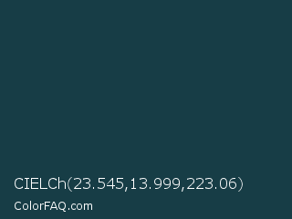 CIELCh 23.545,13.999,223.06 Color is a very dark cyan color and the nearest color is Elephant #123447. Hex code #173d46 and RGB value is rgb(23,61,70). In RGB color space, this color is composed of 9% red, 24% green, 27% blue, In CMYK color space, this color is composed of 67% cyan, 13% magenta, 0% yellow , 73% black , In HSL color space, this color has a hue angle of 191° , 51% saturation and 18% lightness.